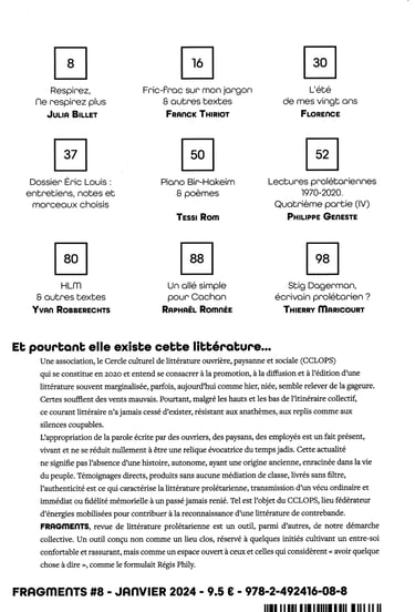Les pages de Fragments sont donc ouvertes à ceux et celles qui se reconnaissent dans notre démarche, dans notre combat au service d’une écriture authentique, témoignage des réalités sociales, humaines, individuelles, collectives. Agissant ainsi, nous nous considérons comme un maillon d’une vaste chaîne construite dans le temps et l’espace, un maillon que nous souhaitons consolider par le développement horizontal et progressif d’un réseau, par la mise en place de correspondants locaux soucieux d’enrichir la revue, ici et en ignorant les frontières, par l’émergence de colporteurs ayant à cœur de diffuser la revue. Un vaste plan de travail, ambitieux certes mais n’excluant aucune lucidité quant aux moyens limités dont nous disposons.