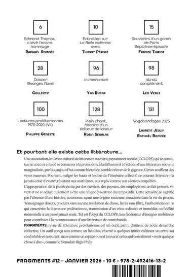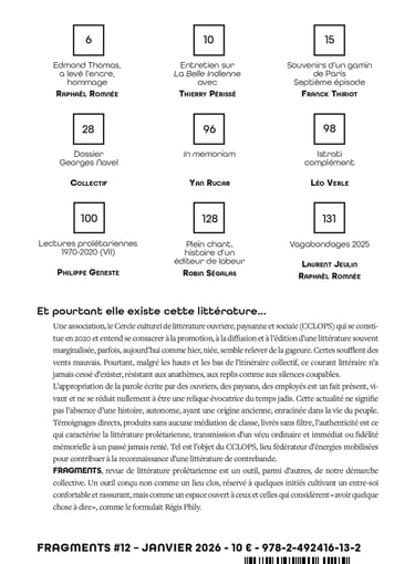 La revue se veut un support, parmi d’autres, de notre activité qui entend aborder la réalité non seulement passée de la littérature produite par des ouvriers, des paysans, des employés, mais également proposer des témoignages contemporains de ces écrits voués parfois à la confidentialité. Nous souhaitons contribuer à l’émergence de textes qui croupissent parfois dans des tiroirs, favoriser la parution de manuscrits révélateurs de cette authenticité de la vie exprimée sous le prisme d’un regard tiers, aller à la recherche d’inédits d’auteurs dont toutes les créations n’ont pu être prises en considération.